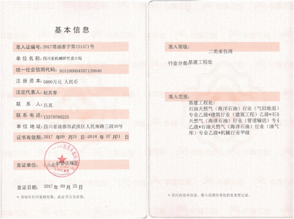 院塔里木油田入網(wǎng)資質(zhì)2017年度換證經(jīng)過(guò)艱難辦理,終于本周二完成并取得證書(shū)。由于院設(shè)計(jì)版塊改革,人員情況隨之變更,以及院QHSE資質(zhì)變更等錯(cuò)綜的情況,給院2017年在塔里木油田入網(wǎng)資質(zhì)換證帶來(lái)了很大的不確定因素,由于新疆分院和川機(jī)工程公司相關(guān)同志堅(jiān)持不懈的努力,使得本次換證成功的意外也有了必然理由。